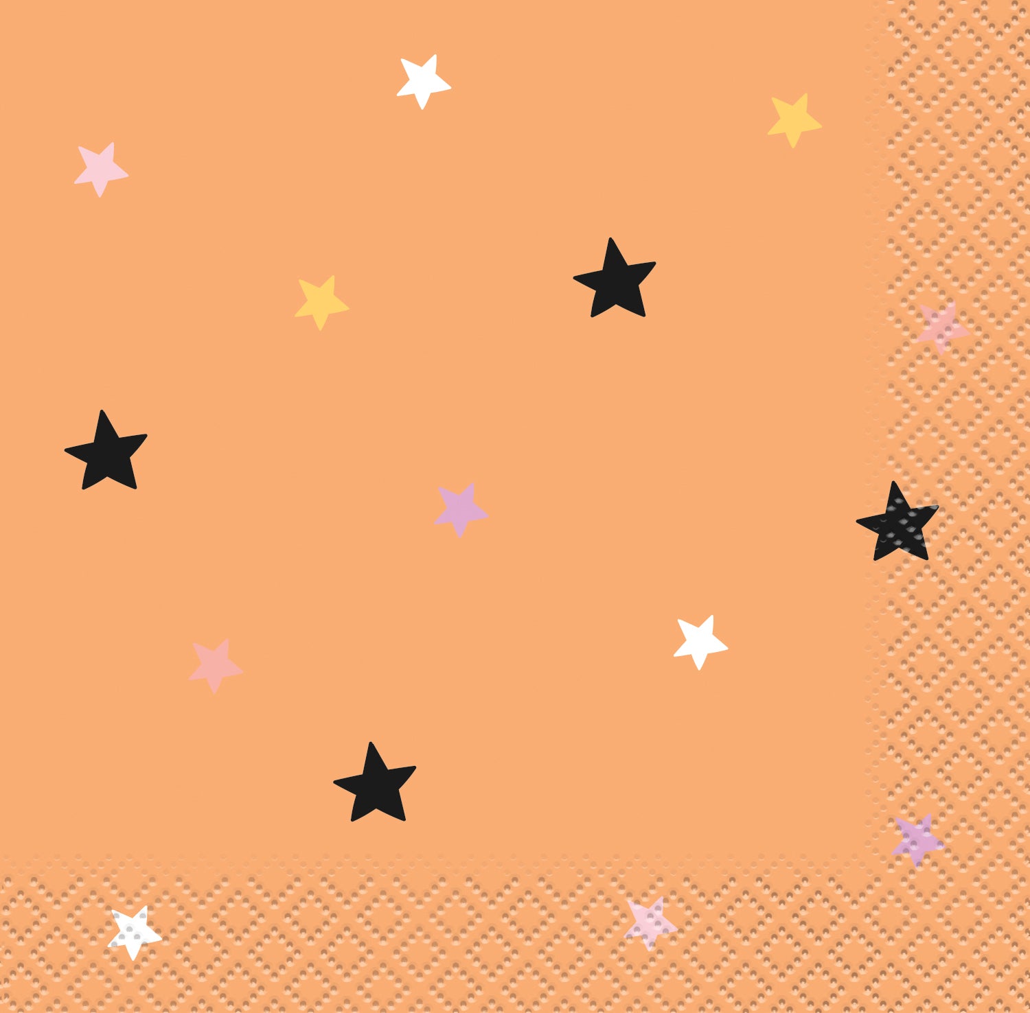 Complete place settings for your party with these beverage napkins. These napkins feature black, purple, and white stars on an orange background.