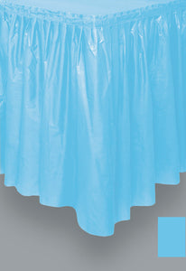 Deck out your table with a Powder Blue Plastic Table Skirt! This powder blue table skirt is a quick and easy way to add some colorful, festive flair to your party. The skirt's adhesive backing makes it easy to use for smaller tables. Use it at your powder blue-themed party — it's also a clever way to hide extra party supplies you might be storing under your buffet tables!