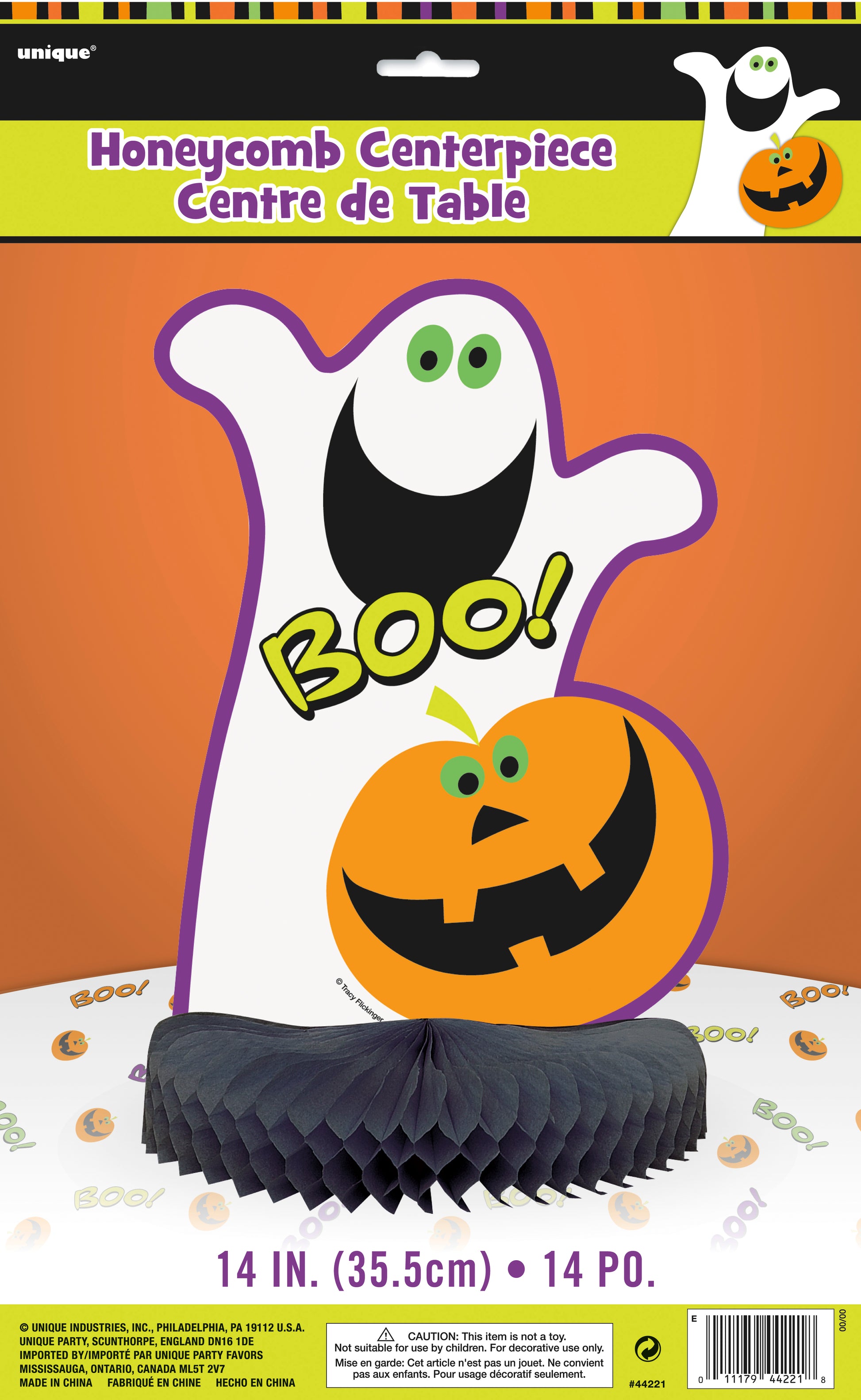 Add a fun, kid-friendly touch to your Halloween party table with this Honeycomb Pumpkin Boo Halloween Decoration. This Halloween centerpiece features a friendly ghost and a smiling Jack-O-Lantern, which makes it an adorable accessory for any Halloween party at home, the office or the classroom. Place this decoration on a snack table, drink table or mantle for a quick and easy Halloween decoration.