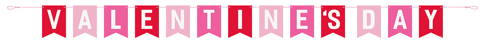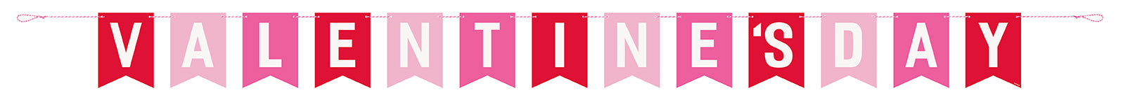 This banner includes two strings with alternating pink, red, and light pink individual pennants with white letters spelling "HAPPY" on the first string and "VALENTINE'S DAY" on the second.