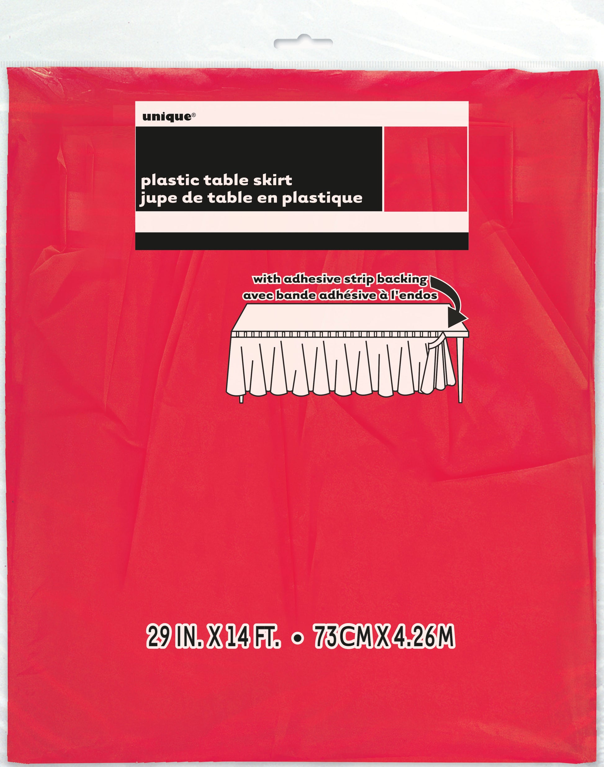 Deck out your table with a Red Plastic Table Skirt! This red table skirt is a quick and easy way to add some colorful, festive flair to your party. The skirts adhesive backing makes it easy to use for smaller tables. Use it at your red-themed party — it's also a clever way to hide extra party supplies you might be storing under your buffet tables!