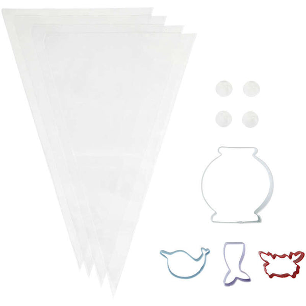 Make cute cookies in fun shapes with this sea life cookie decorating kit! Great for birthdays or themed parties, this kit is fun for kids (and adults) of all ages! Includes one standard cutter in the shape of a fishbowl and three mini cutters: a narwhal, a mermaid tail and a crab. This kit also includes four 12 in. decorating bags and 4 plastic tips for easy decorating!