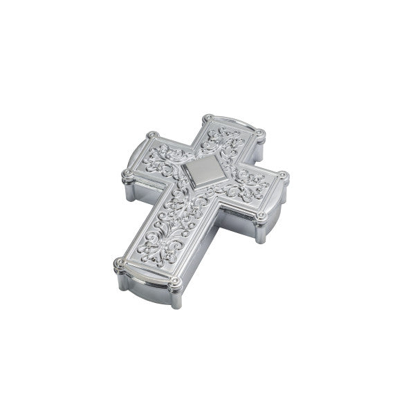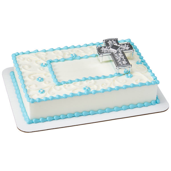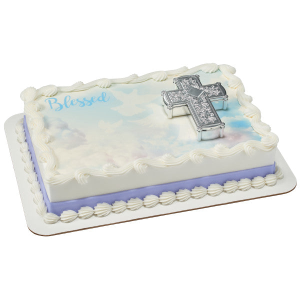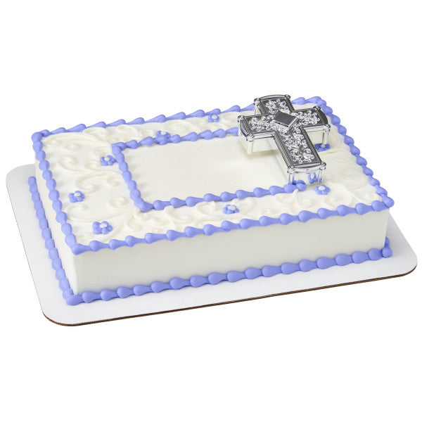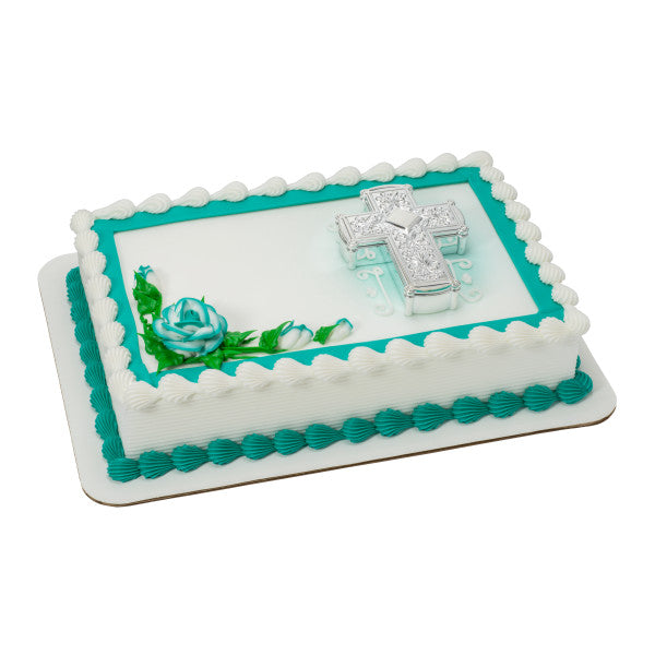 Classic silver cross with scrolling details on the top is also a keepsake box for cherished memories of the occasion. Ideal for use with confirmation, baptism, or other religious cake designs. 1-Piece set.