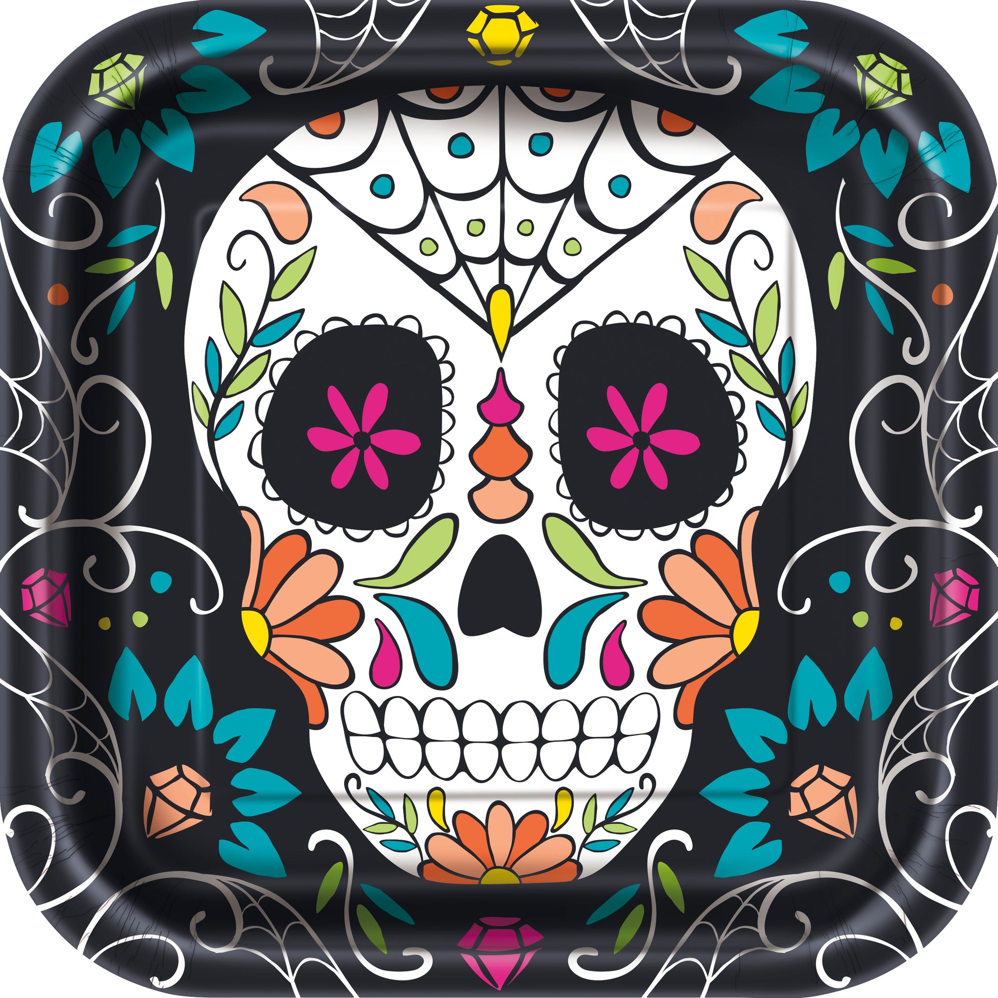 Skull Day of the Dead Square 9" Dinner Plates, 8ct