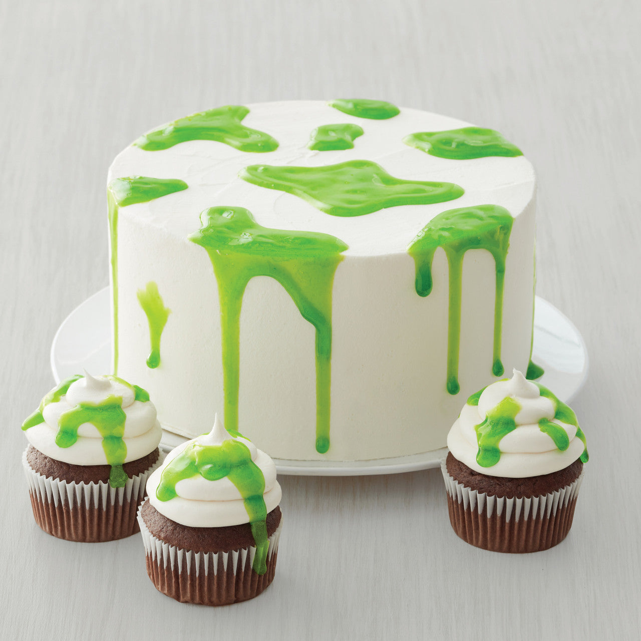 - Give your white Halloween cake a bold pop of color with a drip of this fake slime icing, or use it to add a surprise in the center of homemade cupcakes, truffles or candies.