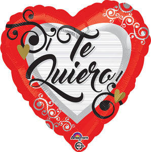 This balloon features the colors red, black, and silver surrounding the phrase "¡Te Quiero!"