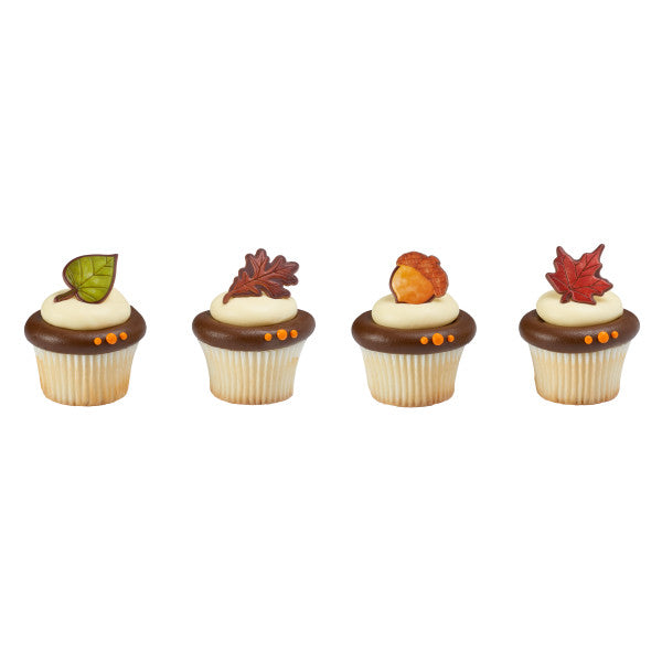 Enhance your Fall dessert display with these autumn colored rings. Assortment includes leaves and acorns. Great for cupcakes, donuts, or even finish off the look of a cake. Made with food-safe plastic.
