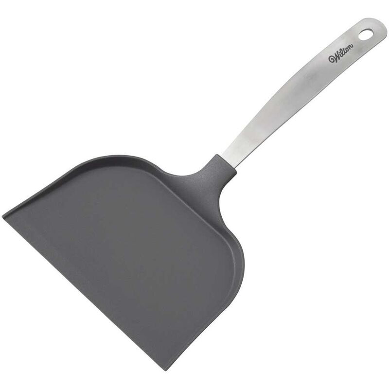 Save time and scoop up more of everything from cookies to appetizers with this extra wide spatula. Safe for non-stick pans. Gray spatula features stainless steel handle.