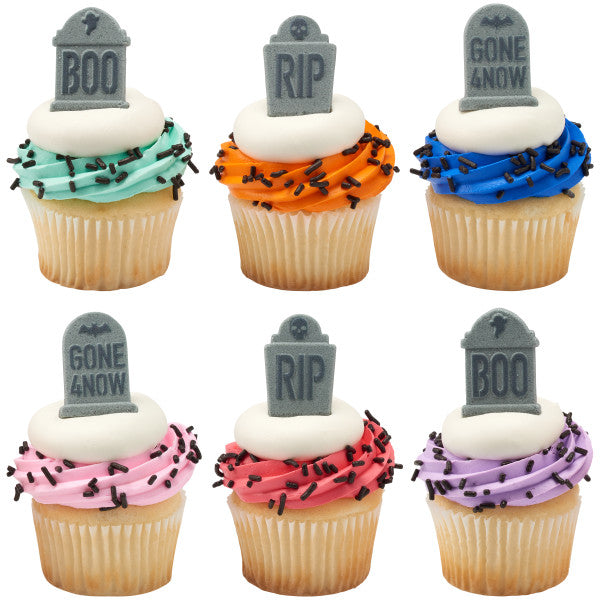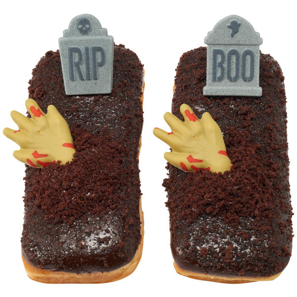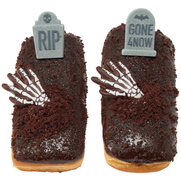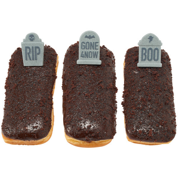 Rest in Peace to your Halloween treats - because they will be Gone 4 Now from the dessert table faster than zombies can rise from the dead! The Tombstones Dec-Ons will have your customers dying over your creations this Halloween season. Make long donuts into a freshly dug grave, or turn cupcakes into a cemetery hill! The creative options are as endless as the afterlife . . . Assortment might not include an equal number of each design. Dimensions: