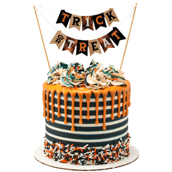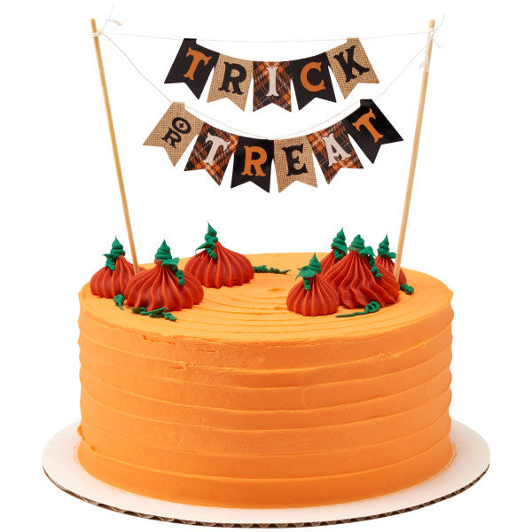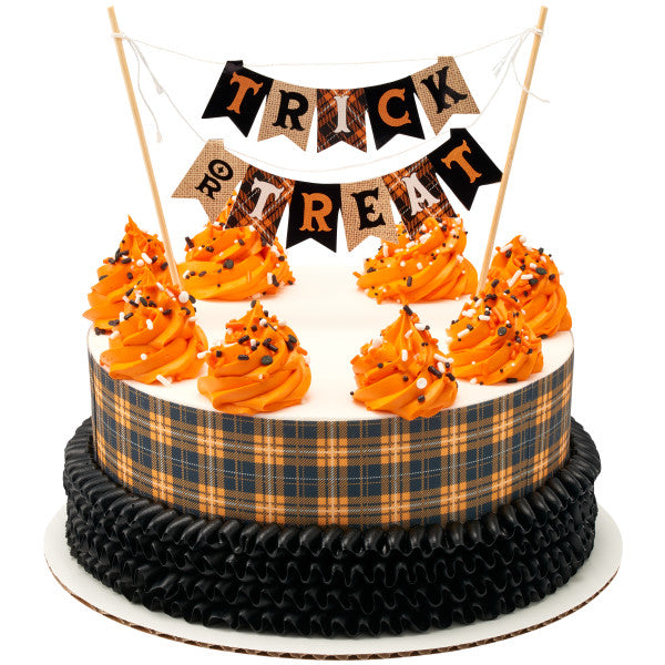 It's always Halloween in bakery with the Trick or Treat Banner! This adorable rustic and burlap inspired banner takes your cake back to the nostalgic days of Halloween past. Featuring whimsical fonts, classic colors and mix and match patterns, this banner is a great way to bring the classic Halloween spirit to the top of your treats. Dimensions: