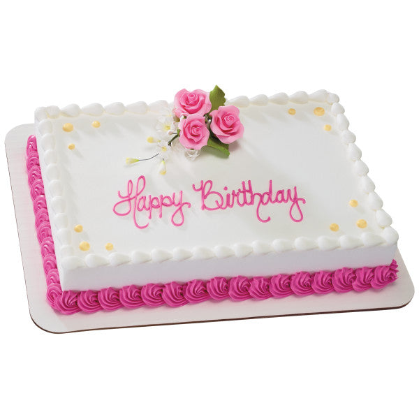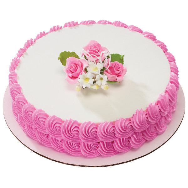 Decorate a cake with these light pink roses, featuring small white accent flowers and green leaves. Gum paste is safe for food contact and not intended to be eaten. Contains wires. Due to the nature of this product, some breakage may occur and the product has been priced accordingly.