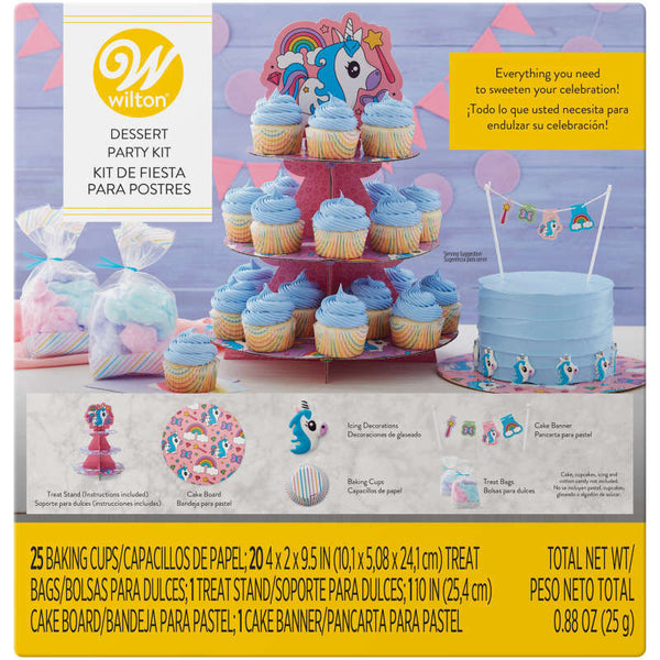 Be party ready in no time with this inclusive dessert party kit! Featuring the items you need to take your celebration from bland to grand, this grab-and-go kit is entertaining made easy. Featuring a magical unicorn theme, this kit includes a 3-tier treat stand, a 10 in. cake board, unicorn-shaped icing decorations, 25 baking cups, 20 treat bags and a decorative cake banner.