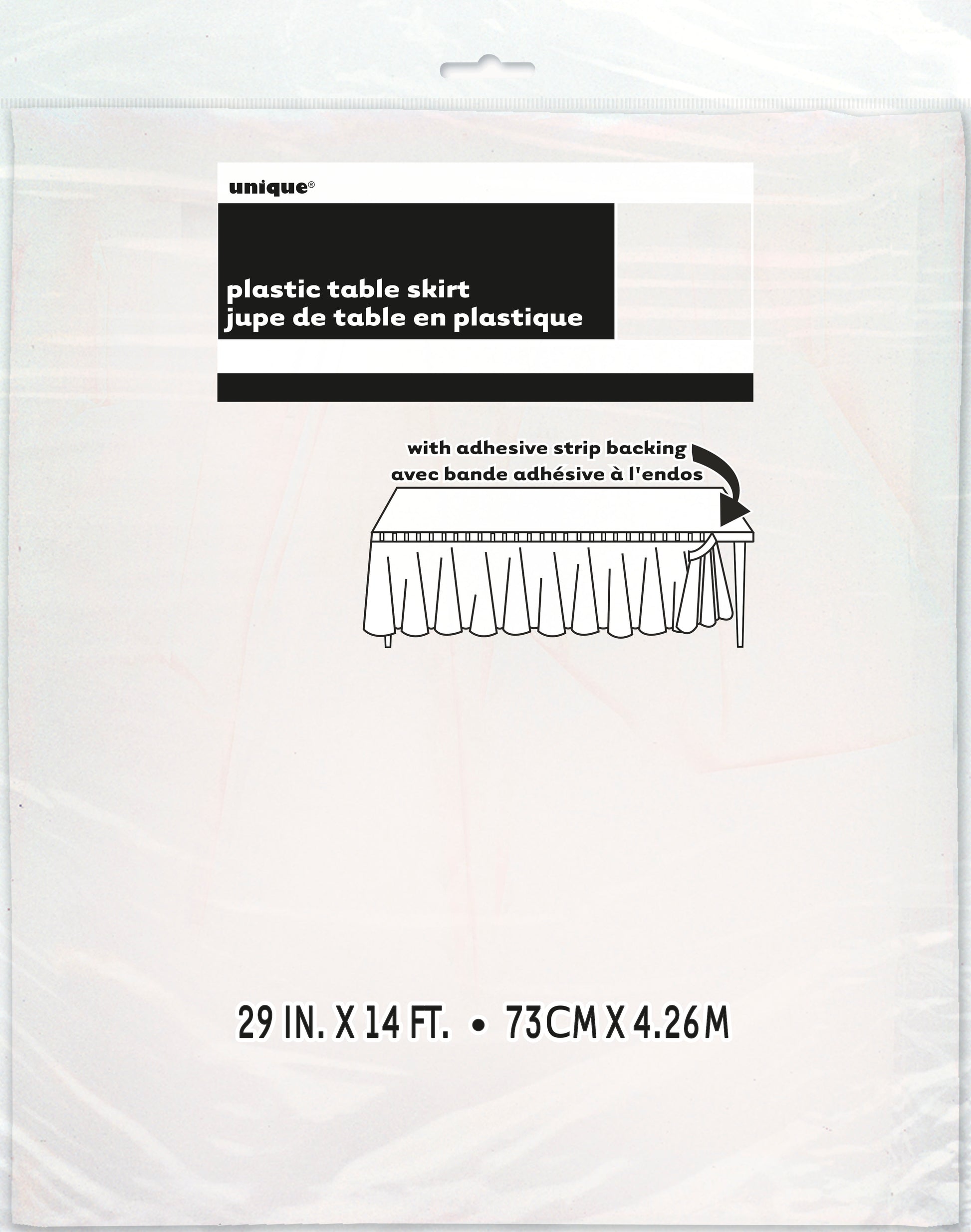 Deck out your table with a White Plastic Table Skirt! This white table skirt is a quick and easy way to add some colorful, festive flair to your party. The skirt's adhesive backing makes it easy to use for smaller tables. Use it at your gold-themed party — it's also a clever way to hide extra party supplies you might be storing under your buffet tables!
