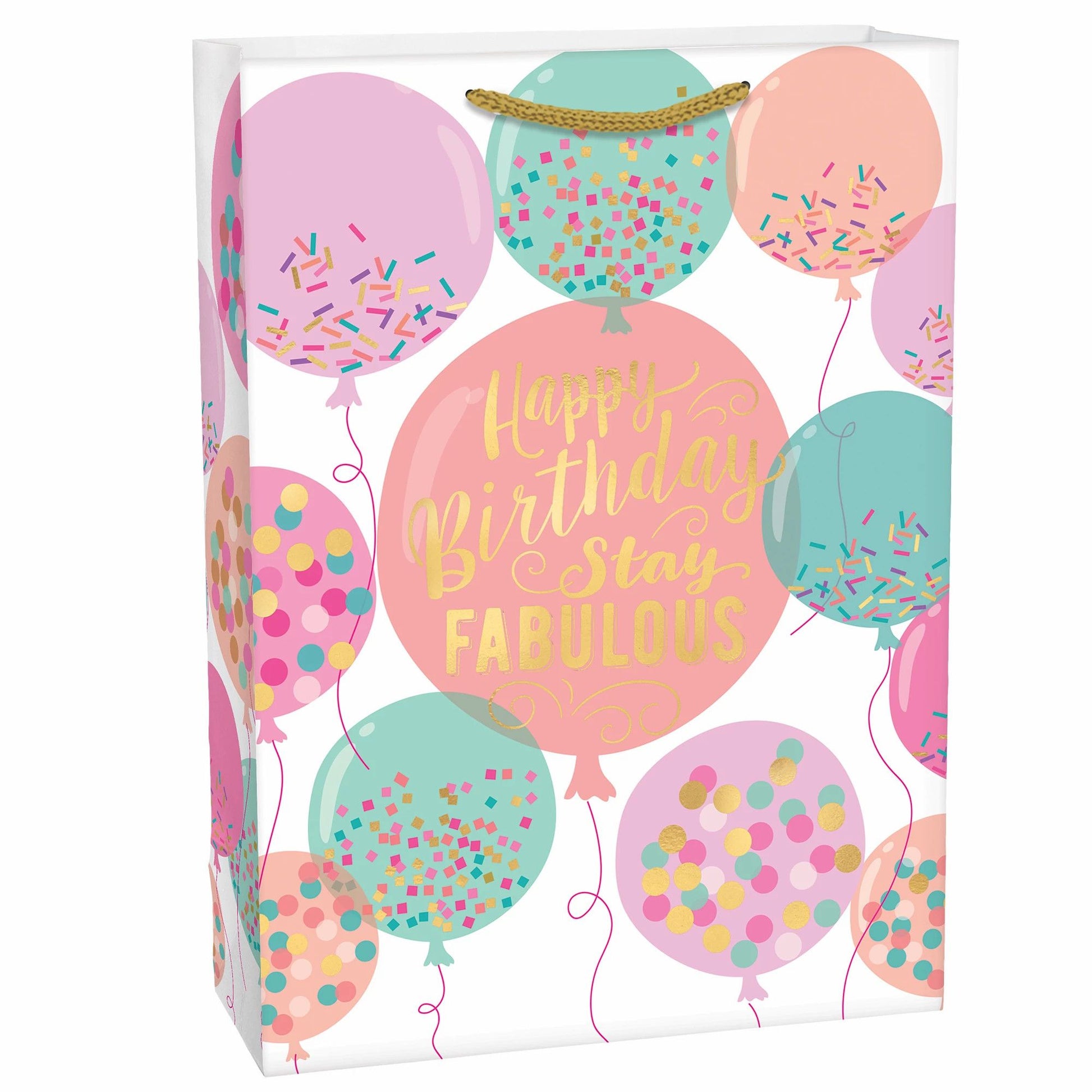 Any birthday will be a fabulous one when you give the birthday girl or boy a present in a Fabulous Birthday Gift Bag! A white paper gift bag featuring designs of orange, pink, and teal balloons is perfect for holding birthday presents. The bag features one large pink balloon with a metallic gold "Happy Birthday Stay Fabulous" headline on it. Birthdays are special, so give the birthday girl or boy a fabulous gift in this gift bag!
