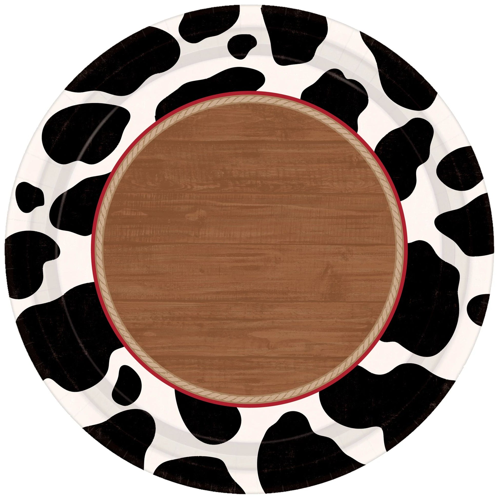 Serve up a proper country dinner on Yeehaw Western Dinner Plates! These large round paper plates feature a rustic wood print with a black and white cow pattern border. These western-themed plates are a perfect addition to your western party or rodeo party. Hungry cowboys and cowgirls can load up these sturdy and disposable paper plates with food and neatly toss them in the waste basket when they're done eating!